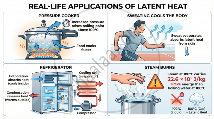 - Cooking at hill stations: Lower atmospheric pressure means water boils 100 °C below, making cooking slower.