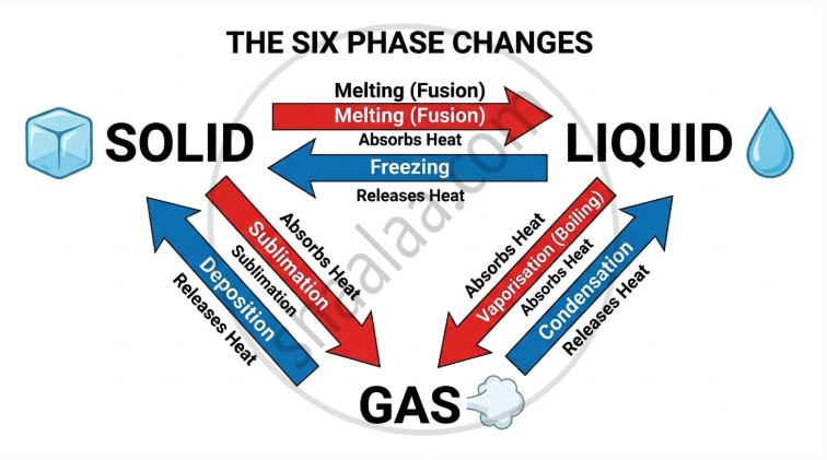 All possible transitions between solid, liquid, and gas — and their reverse — are summarised below.