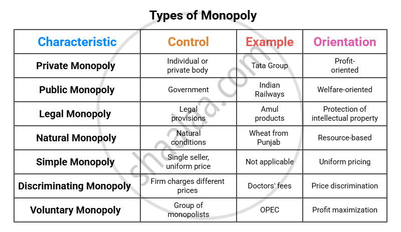 - Types include private, public, legal, natural, simple, discriminating, and voluntary (cartel) monopolies.