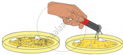 - A saucer containing a mixture of sand, pieces of paper, sawdust, iron filings, and pins