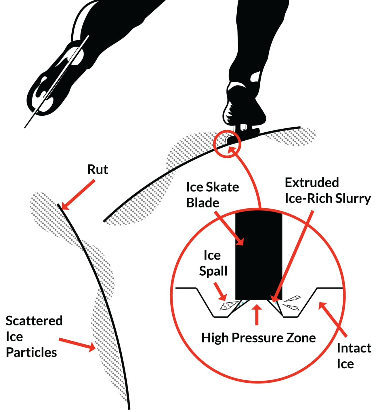 Diagram of an ice skate blade creating a high-pressure zone and an ice-rich slurry for low friction