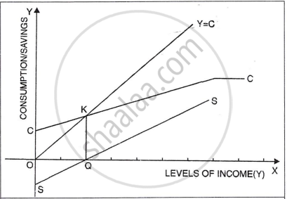 X-axis: Income; Y-axis: Consumption/Savings. 45° line = C=Y. CC curve (upward, below 45°) shows rising but slower C. SS curve starts negative (borrowing), crosses zero at breakeven. Point K: Y=C (no savings).