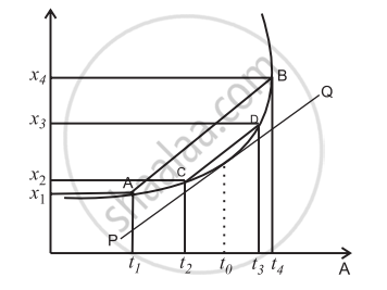 As the time interval around t0 gets smaller (e.g., from line AB to CD, and so on), the secant line gets closer and closer to the tangent line (PQ). The slope of this tangent line gives the instantaneous velocity at that exact moment.