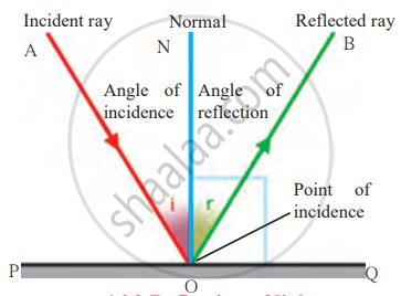 - Mark the incoming ray (incident ray, AO), reflected ray (OB), and normal line (ON) perpendicular to the mirror at the point of incidence (O). As ON is perpendicular to PQ, ∠PON = ∠QON = 90°.