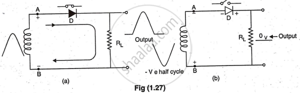 i) Refer to the circuit diagram and waveforms. In the first half cycle of AC voltage, when terminal A of the transformer is positive relative to terminal B (fig. 1.27a), the diode becomes forward-biased and acts as a closed switch. Current flows from terminal A through RL to terminal B, producing an output voltage across RL like the positive half cycle of the AC input