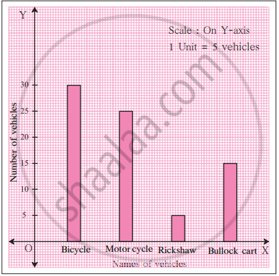 The following information is to be represented as a bar graph: The number of different types of vehicles is: 5, 15, 25, and 30. Use the X-axis to represent the types of vehicles. Use the Y-axis to represent the number of vehicles. Take a scale of 5 vehicles = 1 big unit.