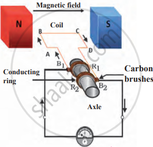 2. The ends of the coil are connected to conducting rings (R1 and R2) via carbon brushes (B1 and B2).