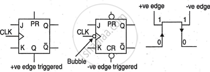 In a positive edge-triggered flip-flop, the output changes at the rising clock edge (0 to 1). In a negative edge-triggered flip-flop, it changes at the falling edge (1 to 0). The J-K flip-flop has PR (PRESET) to set the output and CR (CLEAR) to reset the output independently of J, K, and the clock.
