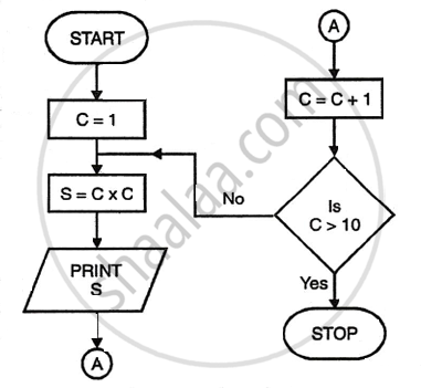 2) Flowchart to find squares of numbers from 1 to 10.
