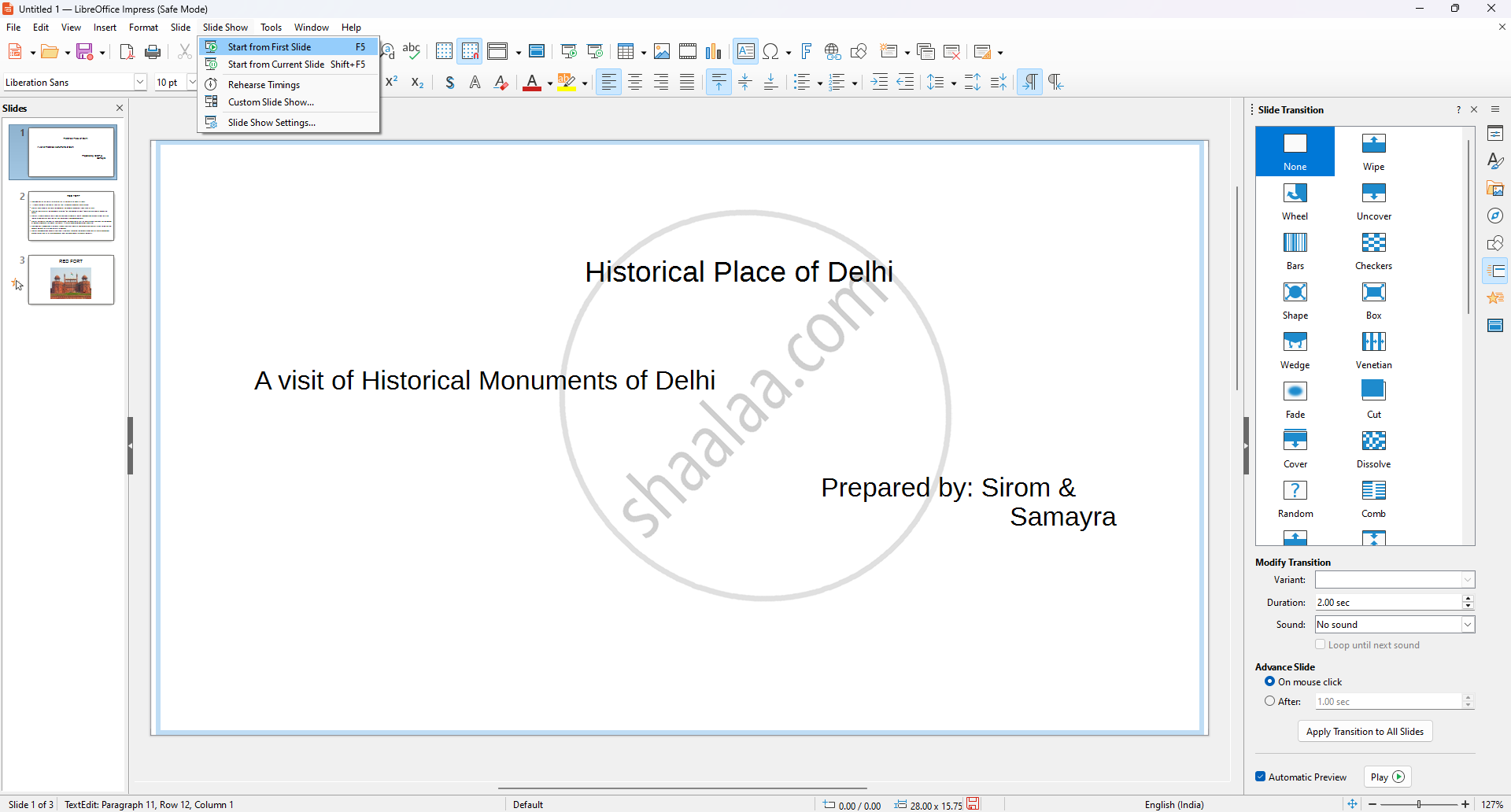 Step 2 : For more additions to the slide presentation and to make it more attractive, from the top bar menu, click on Slide → Slide Transitions. Choose the transitions required in slides and can adjust time, sound, variant, etc.
