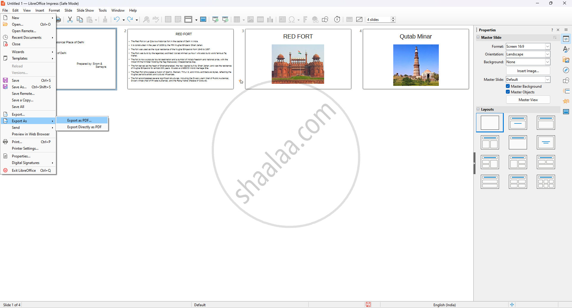 Step 1: On top bar menu, click on File → Export As → Export as PDF or export as PDF directly. The presentation will be converted into PDF document form.