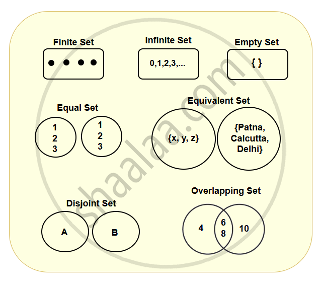 | Equivalent Sets | Two sets with the same number of elements, but not necessarily identical. | A = {x, y, z} B = {Patna, Calcutta, Delhi} |