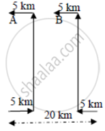 A and B are standing at a distance of 20 km from each other on a straight East-West road. A and B start walking simultaneously eastwards and westwards respectively and both cover a distance of 5 km. Then A turns to his left and walks 10 km. B turns to his right and walks 10 km at the same speed. Then both turn to their left and cover a distance of 5 km at the same speed.