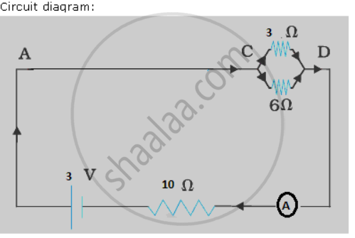 A battery o f e.m.f. 3 Vis connected in series with an ammeter, a 10 Ω coil of wire and with a parallel combination o f resistance of 3Ω and 6 Ω. Draw a circuit diagram for the above arrangement. What is the