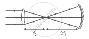 The convex lens will form image at its focus, i.e. at a distance f2 from it. If this image falls on the centre of curvature of the concave mirror, the rays falling on it will be normal to the mirror and retrace their path.
