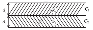 `C_(eq) = ((k_1ε_0A)/(d_1))/((k_1ε_0A)/(d_1)) ((k_2ε_0A)/(d_2))/((k_2ε_0A)/(d_2)) = (k_1k_2ε_0A)/(k_1d_2 + k_2d_1)` ......(i)