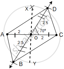 - From A and C, draw arcs of radius more than half the length of AC on both sides, Let they cut at X and Y. XY is the perpendicular bisector of AC. It cuts AC at O.
