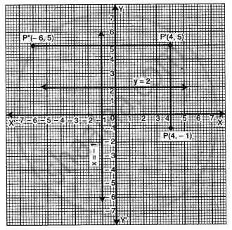 A point P(4, – 1) is reflected to P’ in the line y = 2 followed by the reflection to P” in the line x = -1. Find :