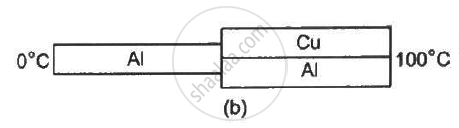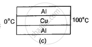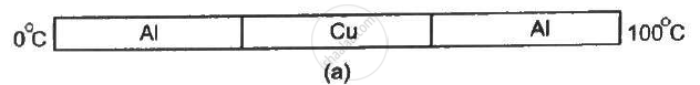 The three rods shown in figure have identical geometrical dimensions. Heat flows from the hot end at a rate of 40 W in the arrangement (a). Find the rates of heat flow when the rods are joined as in arrangement (b) and in (c). Thermal condcutivities of aluminium and copper are 200 W m−1°C−1 and 400 W m−1°C−1 respectively.