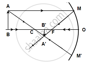 A light ray coming from a point on object AB is reflected from the surface of the mirror, it passes through the principal focus and the other ray passing through the center of curvature strikes the mirror normally i.e. 90 degrees. Hence it will reflect back. These two reflected rays coincide at a point where the image is formed. The image, A'B' is real, inverted, and diminished in size. The focal length was found to be 16 mm.