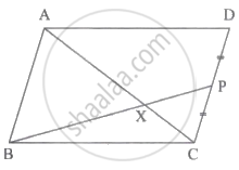 □ABCD समांतर चतुर्भुज है। बिंदु P, भुजा CD का मध्यबिंदु है। रेख BP यह विकर्ण AC को बिंदु X पर प्रतिच्छेदित करती है, तो सिद्ध करो कि 3AX = 2AC.