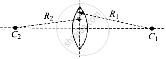 `1/f_1 = (mu - 1) (1/((+ R_1)) - 1/((-R_2))) = (mu - 1)(1/R_1 + 1/R_2)`