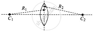 `1/f_2 = (mu - 1) (1/((+ R_2)) - 1/((-R_1))) = (mu - 1)(1/R_1 + 1/R_2)`