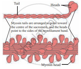 - In sarcomere, myosin tails are arranged to point towards the centre of the sarcomere and the heads point to the sides of the myofilament band.