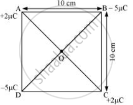 दी गई आकृति में 10 सेमी भुजा वाला एक वर्ग दिखाया गया है जिसके कोनों पर चार आवेश रखे गए हैं। O वर्ग का केंद्र है।