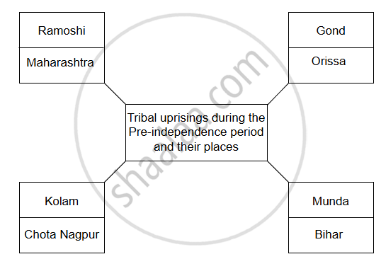 Complete the following concept map: Tribal uprisings during the Pre-independence period and their places Ramoshi Gond Kolam Munda - History and Political Science
