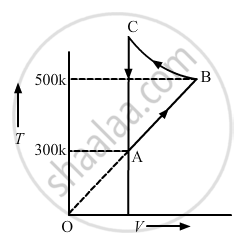 Consider the cyclic process ABCA, shown in figure, performed on a sample of 2.0 mol of an ideal gas. A total of 1200 J of heat is withdrawn from the sample in the process. Find the work done by the gas during the part BC.
