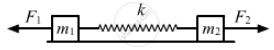 Consider the situation of the previous problem. Suppose the block of mass m1 is pulled by a constant force F1 and the other block is pulled by a constant force F2. Find the maximum elongation that the spring will suffer.