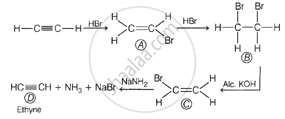 \[\ce{CH ≡ CH ->[HBr] A ->[HBr] B ->[Alc. KOH]C->[NaNH2]D}\]