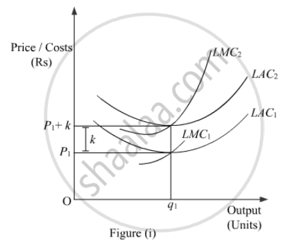 In the diagram, LAC1 and LMC1 are the long run average cost curve and long run marginal cost curve respectively. In the lower panel we represent the supply curve which is the rising part of the LMC. Suppose, initially the firm faces price equal to OP1. Now, if the government imposes a unit tax of Rs ‘k’ per unit of output, then this will raise the cost of production as the firm need to pay an extra amount of Rs k on each unit of the output supplied. Consequently, the cost curves will shift leftwards (upwards) to LMC2 and LAC2. The magnitude of the shift in the cost curves is equal to Rs k. Now, as the supply curve is a rising part of LMC, so the supply curve in the figure (ii) will also shift leftward upwards from S1 to S2. That is, the firm will now supply lesser units of output due to imposition of tax.