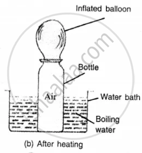 (ii) Place the bottle in a water bath containing boiling water. After some time you will notice that the balloon gets inflated as shown in the following figure. The reason is that the air inside the bottle expands on heating and it fills the balloon.