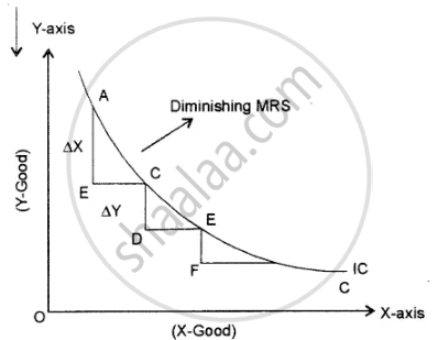 AB > CD > EF or diminishing MRS. - Indifference Curve will not touch either the X-axis or the Y-axis. An indifference curve cannot touch the X-axis or Y-axis because the customer would consume only one good. Indifference curves show equal-satisfaction pairings of items. No combination or trade-off exists if one good is zero; hence, the marginal rate of substitution doesn't apply. Therefore, the curve cannot contact either axis.