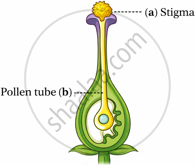 Draw a neat diagram to show germination of pollen on the female reproductive part of the flower. Name and label only the following parts: