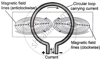 Draw the pattern of magnetic field lines of the magnetic field produced by a current-carrying circular loop. Mark on it the direction of (i) current and (ii) magnetic field lines.