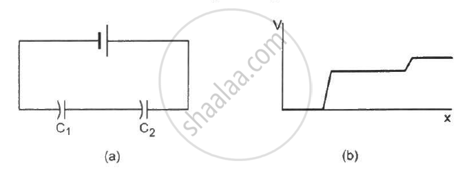 The following figure shows two capacitors connected in series and joined to a battery. The graph shows the variation in potential as one moves from left to right on the branch containing the capacitors.