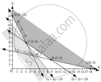 चूंकि संभव क्षेत्र अप्रभावित है, इसलिए 1950 z का न्यूनतम मूल्य हो सकता है या नहीं भी हो सकता है। इसके लिए, हम असमानता का एक ग्राफ खींचते हैं, 250x + 2007 < 1950 या 5x + 4y < 39, और जांचते हैं कि परिणामी आधे विमान में संभव क्षेत्र के साथ अंक हैं या नहीं। यह देखा जा सकता है कि संभव क्षेत्र 5x + 4y < 39 के साथ कोई सामान्य बिंदु नहीं है, इसलिए, z का न्यूनतम मूल्य 2000 (3, 6) है। इस प्रकार, ब्रांड पी के 3 बैग और ब्रांड क्यू के 6 बैग का उपयोग मिश्रण में किया जाना चाहिए ताकि लागत को रु 1950 तक कम किया जा सके।