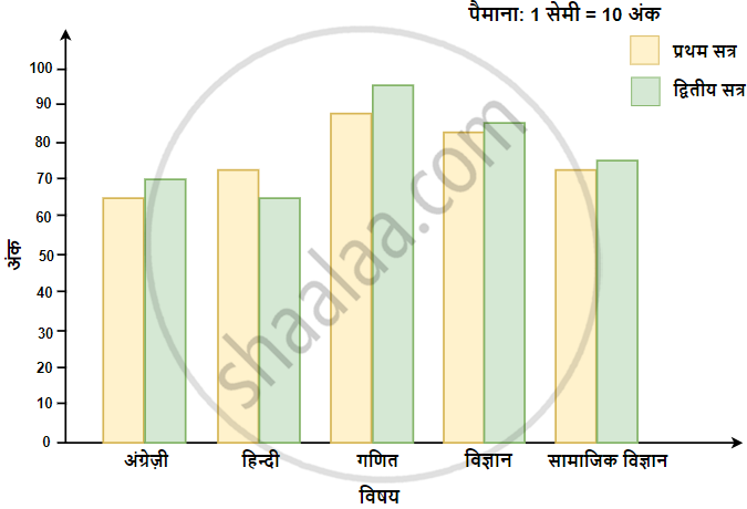 एक विद्यार्थी के प्रथम सत्र और द्वितीय सत्र का प्रदर्शन दिया हुआ है। एक उपयुक्त स्केल चुनकर एक दोहरा दंड आलेख खींचिए और दिए गए प्रश्नों के उत्तर दीजिए: