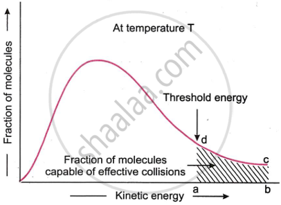 Until the reacting molecules have a specific minimum amount of energy known as the threshold energy, their collisions cannot be successful. This indicates that only when two reacting molecules have energy greater than or equal to the threshold energy will their collisions be effective and result in the production of products. Fig. shows the energy distribution between colliding molecules at a specific temperature. The percentage of molecules with energy above or equal to the threshold energy that can collide effectively is shown by the turned area abed.