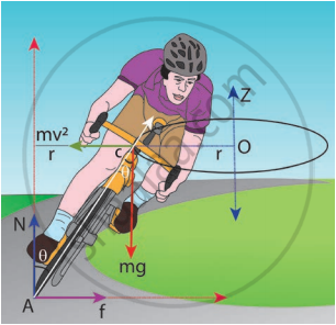 Let us consider a cyclist negotiating a circular level road (not banked) of radius r with a speed v. The cycle and the cyclist are considered as one system with mass m. The center gravity of the system is C and it goes in a circle of radius r with center at O. Let us choose the line OC as X-axis and the vertical line through O as Z-axis as shown in Figure.