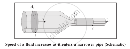 A pipe narrows such that the same volume takes up more length, as the figure schematically illustrates. The cross-sectional area of the larger pipe is A1, and the smaller pipe's is A2. According to the continuity equation, v2 = (A1/A2)v1.
