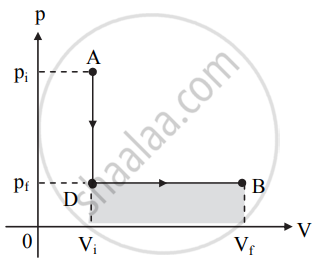 b. After point D, the volume of the system increases to Vf at constant pressure pf as shown in figure (b). c. Work done in this process is represented by the shaded area under the curve in figure (b). - From figures (a) and (b) we can conclude that the work done is more when the system follows path ACB than the work done by the system along the path ADB.