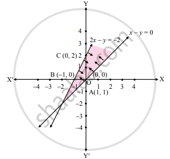 | 2x – y ≥ − 2 | 2x – y = − 2 | `(2"x")/-2-"y"/-2=(-2)/-2` | B (–1, 0) C (0, 2) |