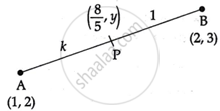 Find the ratio in which the point `(8/5, y)` divides the line segment joining the points (1, 2) and (2, 3). Also, find the value of y.