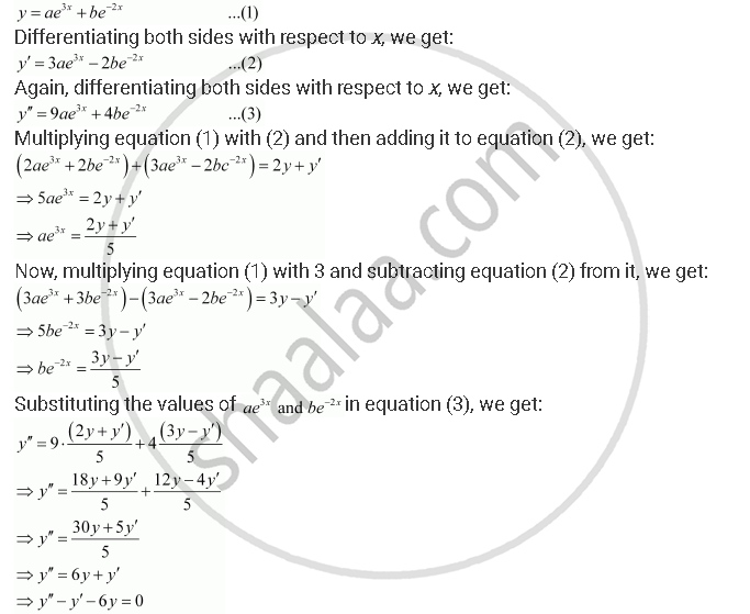 Find the differential equation representing the family of curves `y = ae^(bx + 5)`. where a and b are arbitrary constants.