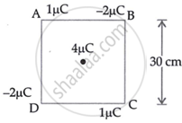 Four point charges of 1μC, −2 μC, 1 μC and −2 μC are placed at the corners A, B, C and D respectively, of a square of side 30 cm. Find the net force acting on a charge of 4 μC placed at the centre of the square.