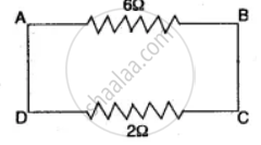 The diagram indicates a square ABCD formed by joining four resistances of 2Ω each, end to end.